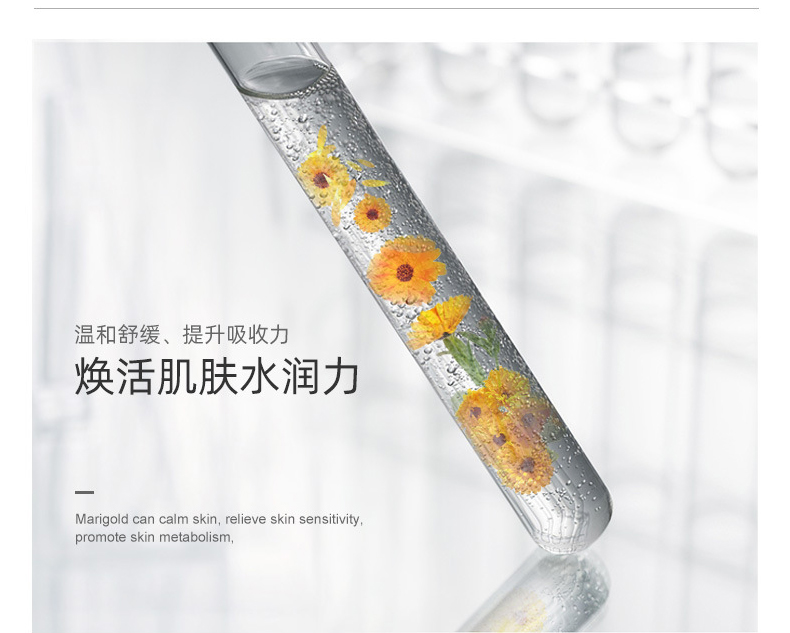 Calendula water extract natural, contains the natural pigment beta-carotene, can promote skin renewal, improve skin quality, but will not cause the phenomenon of artificial color caused by skin yellowing.